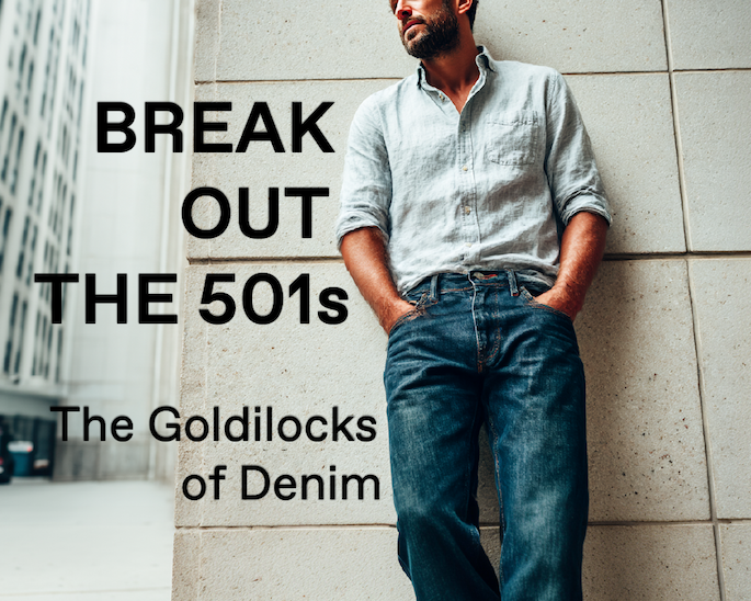 Think classic, think Levi's 501s. Mid-rise, straight or athletic cut, a little structure without the squeeze.