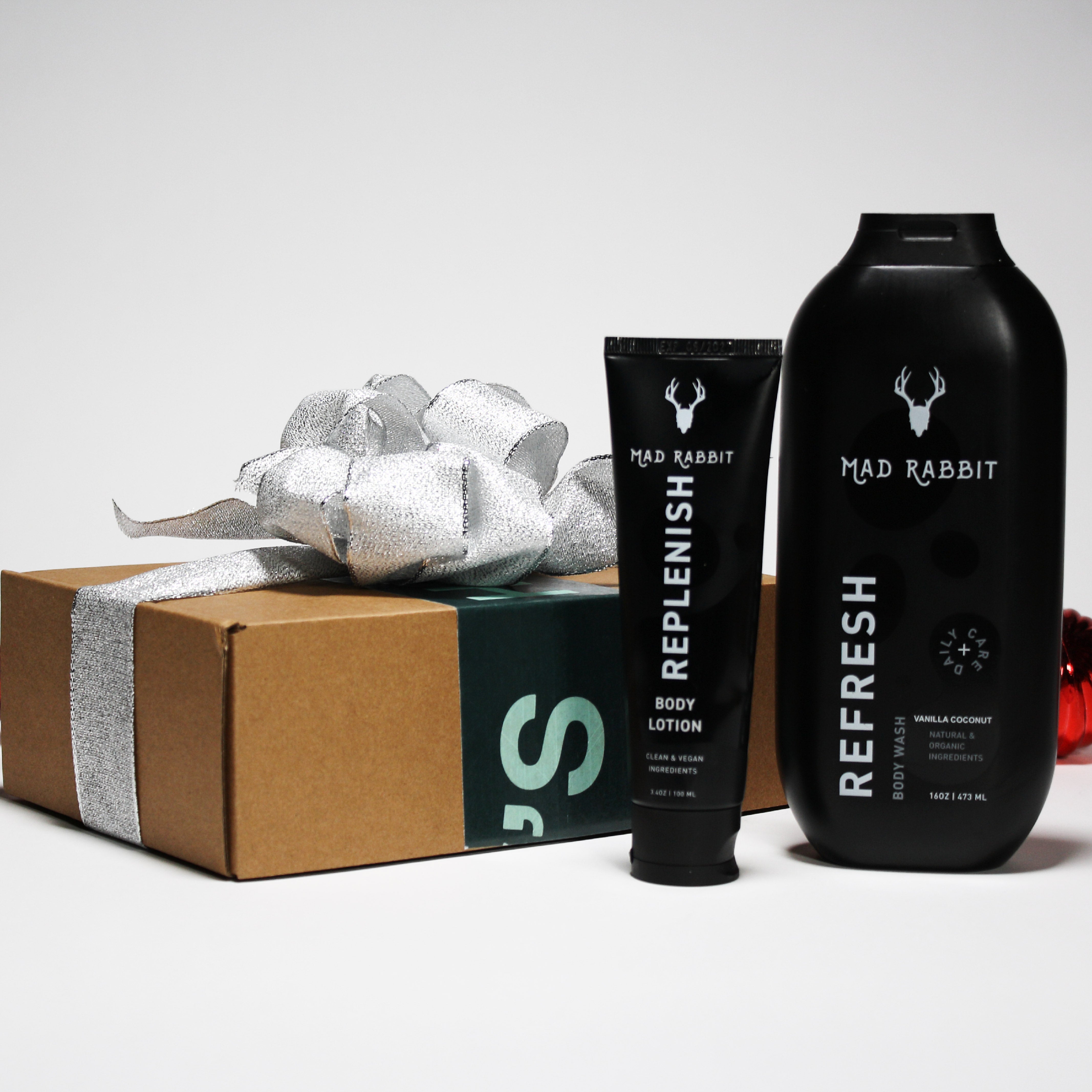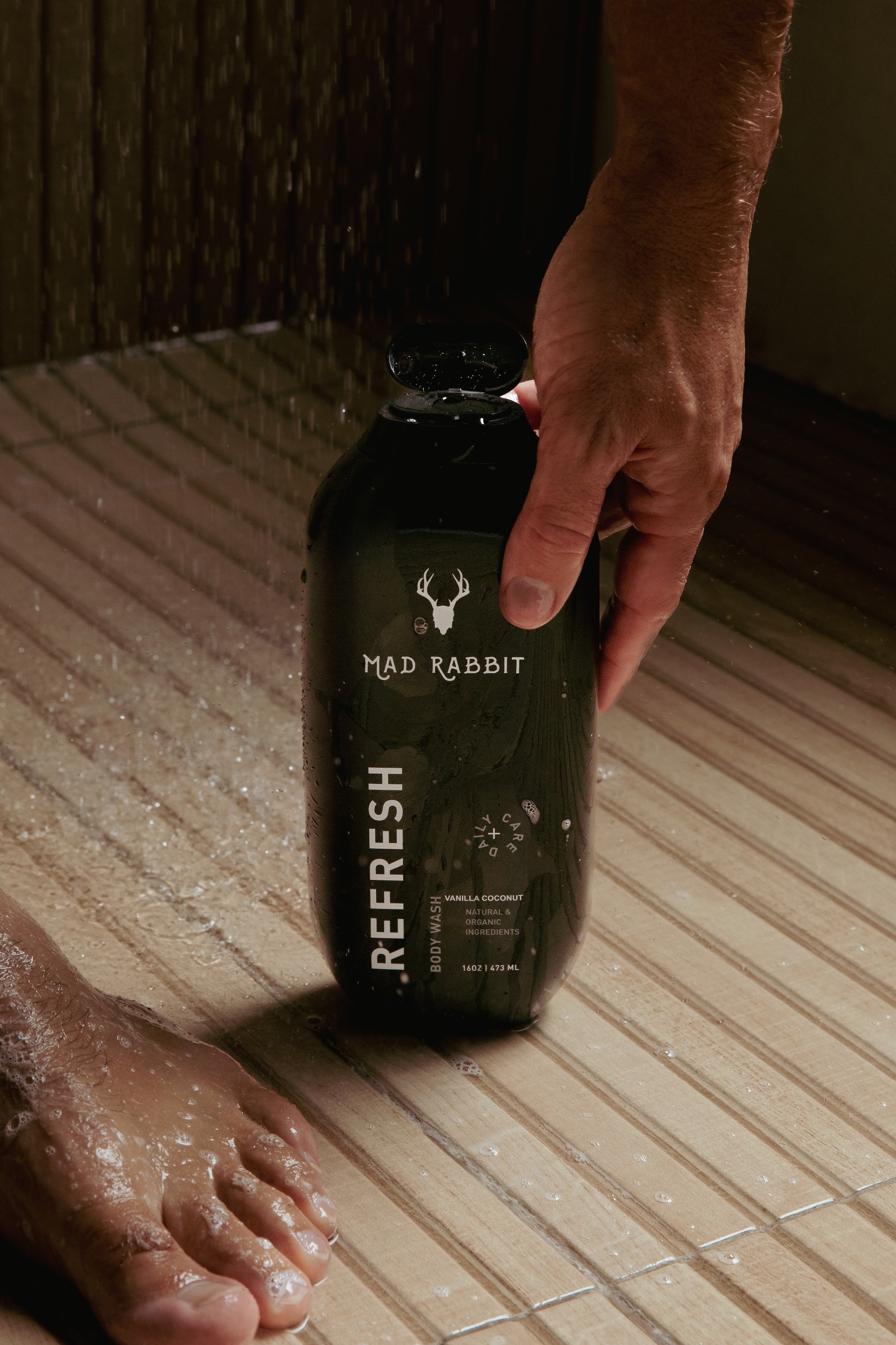 Black bottle of Mad Rabbit Refresh Body Wash with a hand holding it, surrounded by bath products on a wooden surface.